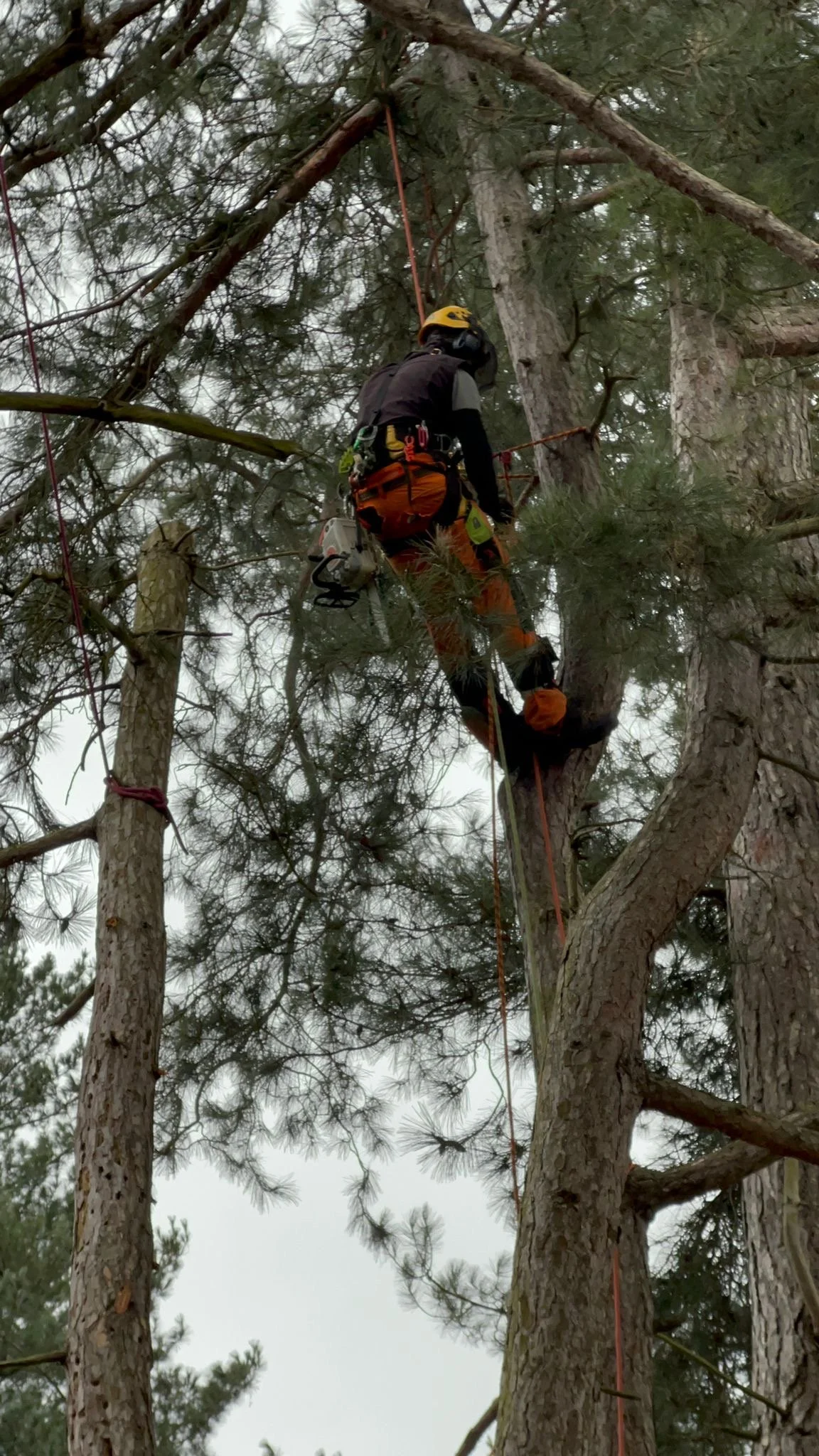 This was a particularly hazardous situation, as we could not predict how the compromised tree would react once cut or dislodged. To ensure safety, our team put protective measures in place. We secured the tree with two separate ropes: one near the crown and another further down the stem. These acted as supports in case the tree swung free during dismantling.