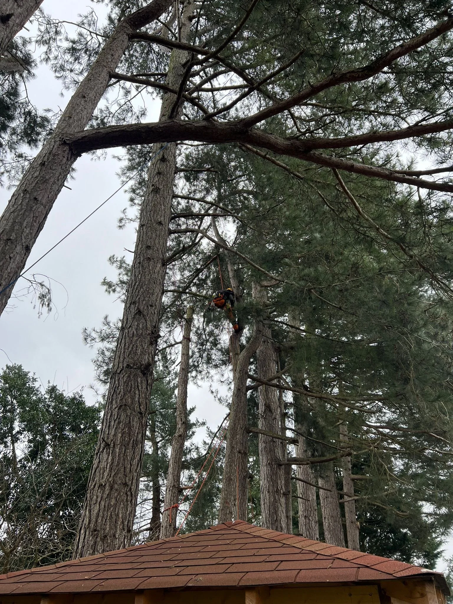 Our client in Cookham had a row of mature pine trees lining the boundary of their property. We were called in to carry out crown lifting, reduction work, and the removal of one pine that had developed root rot. The decayed tree had already failed at the base and was precariously hung up in a neighbouring tree directly above a barn and stable.